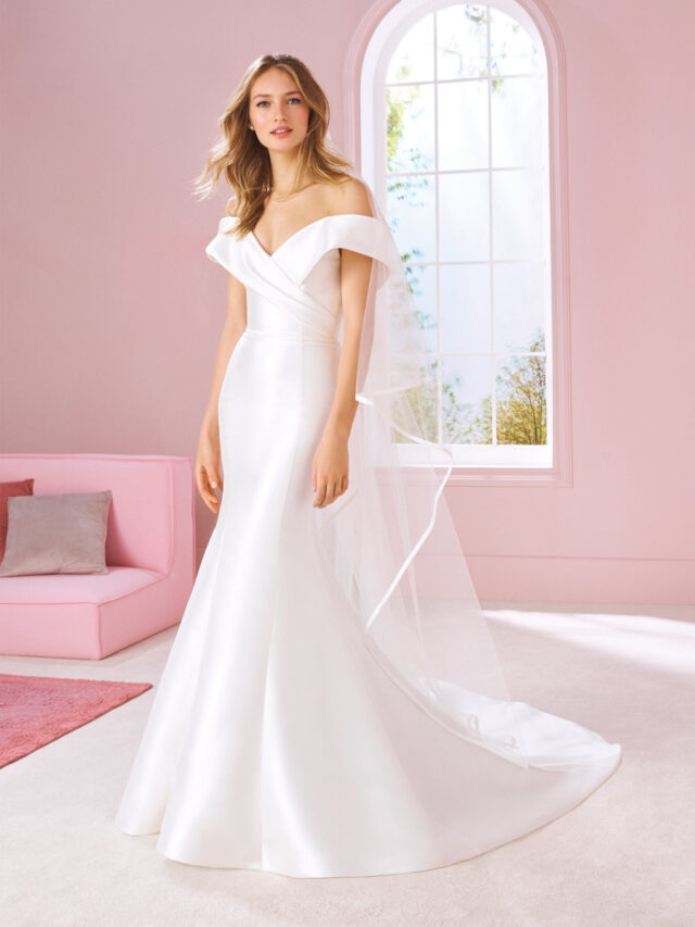 Beautiful, White one gown Tina. Fit and flare shape, mikado fabric.