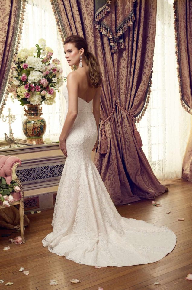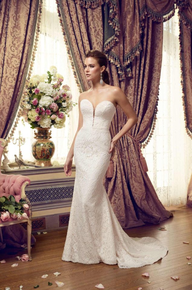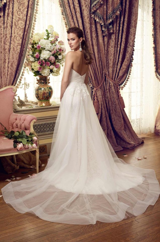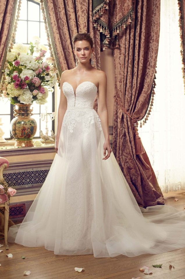 Mikaella Lace and Tulle Wedding Dress. Mikaella Lace gown with strapless sweetheart bodice and plunging neckline. Lace scallop around neckline and hem. Fit and flare skirt. Removable tulle overskirt finished with 4” horsehair edging at hem and cascading lace appliqués at waist.