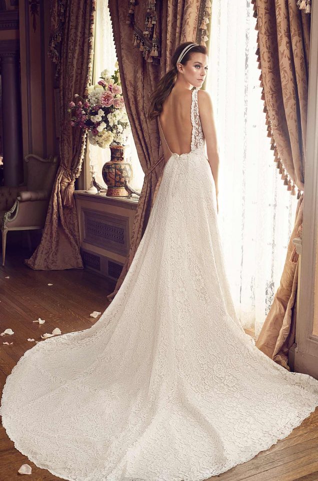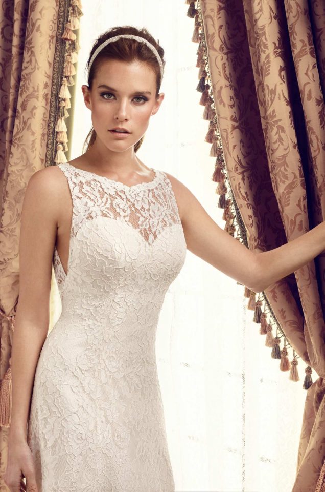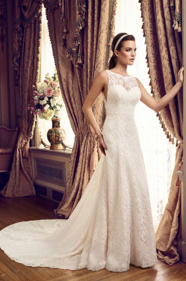 This is a beautiful Mikaella Lace Bridal Dress in Tipperary. It is a full lace A-line gown with bateau neckline and sweetheart neckline on lining. There are V-shaped Italian Tulle inserts at side seam on bodice which adds a unique touch. Notice the scallop around neckline and skirt hem.