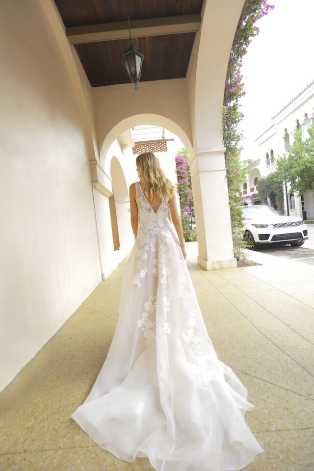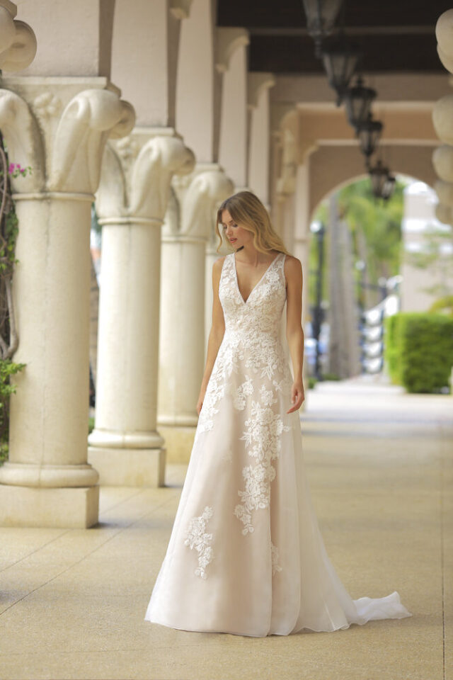 A-line dress with floral lace appliques. Colour Ivory/Nude/Silver