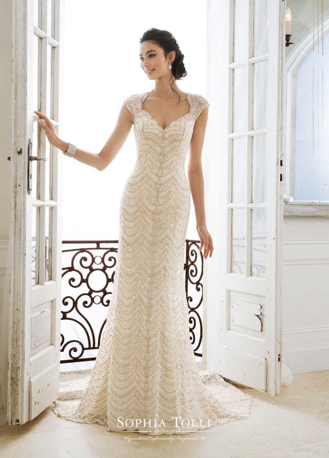 Overlace and satin sheath gown with Queen Anne neckline and sheer cap sleeve. Richly beaded overlace fabrication throughout with scalloped finish. Keyhole back, zipper trimmed and diamante buttons and a court length train.