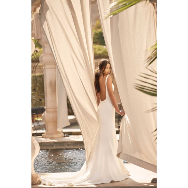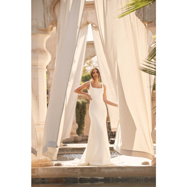 While Aiden is simple she’s far from boring – fitted throughout the bodice she flares from the knee down with ivory crepe pooling into a medium length train. Walking through the dappled sunlight of Marrakech, Aiden proves she is no push-over when it comes to love. Her structured silhouette offers brides an intriguing squared-off neckline which tapers into thin straps. But it’s when Aiden turns, her bare back emulates the tapered, square structure, but un-like previous designs, Aiden dips even lower for the on-trend brides-to-be.
