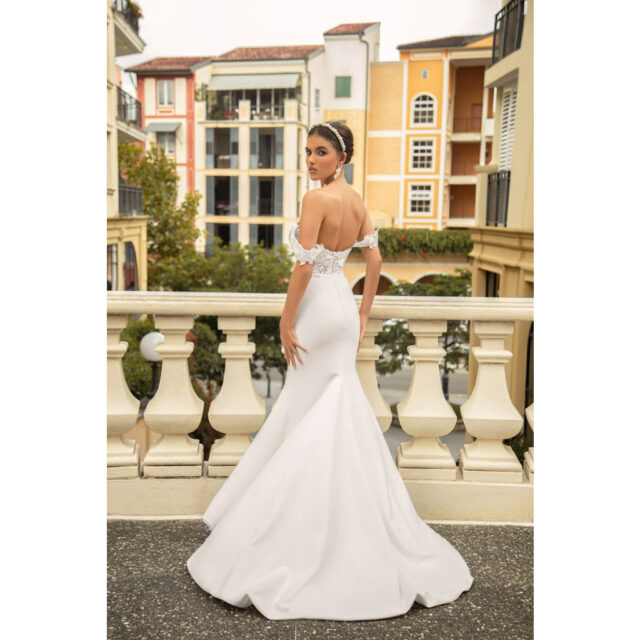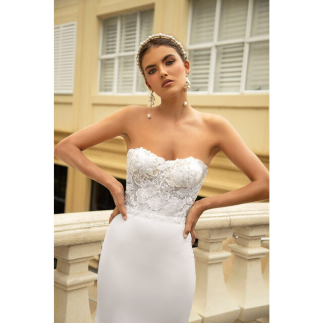 With a soft sweetheart neckline and detachable, lace sleeves, Amelie gown was already the staple off-the-shoulder gown in our collections. Now she is brought to life as a crepe form-fitting silhouette to combine the best of both worlds as the new Amelie-Jane gown.