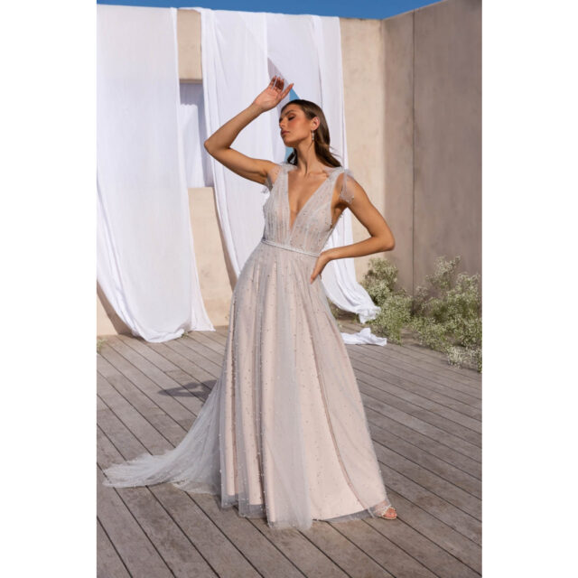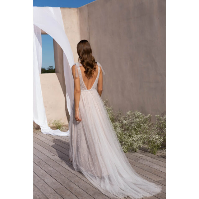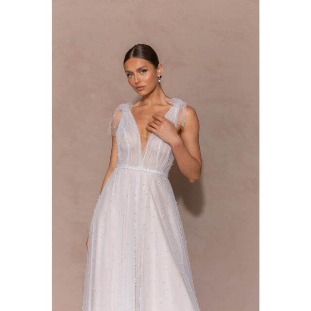 Eve is delicate, refined, elegant and feminine all encapsulated into one fairy-tale-like gown. This ethereal construction is the perfect muse for a whimsical couture bride. Enveloped in a beaded pearl adorned glitter tulle, Eve’s soft charmeuse lining drapes elegantly against the body, with a deep V neckline and classic A line shape.