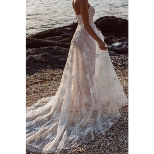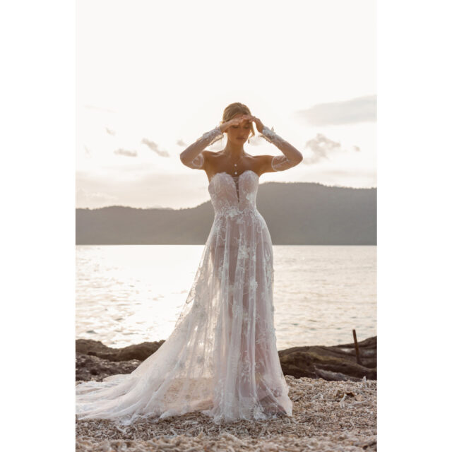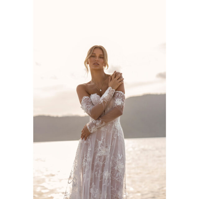 Rising from the ocean you will discover Janae. A strong Madi Lane signature A-line silhouette flattering on all body shapes and sizes. Her character radiates love and passion. Flattering to the eyes is her strapless sweetheart bodice and narrow centre plunge. Discover two looks with her detachable illusion long sleeves button-up wrist to elongate her bride’s arms. Completing Janae’s vision is a beautiful sheet lace with a soft sequin detailing and a 30” illusion train to follow.