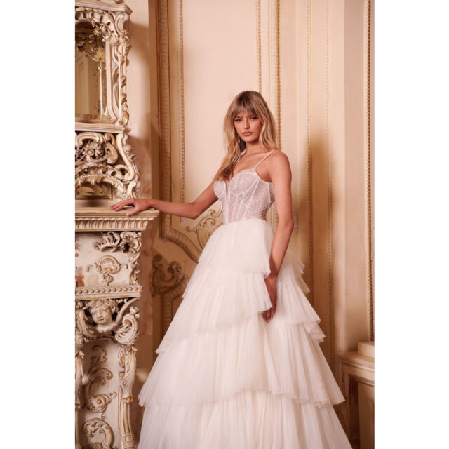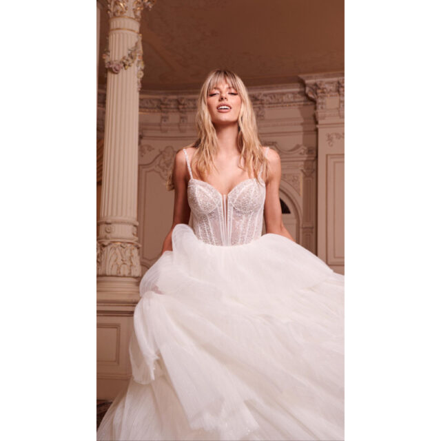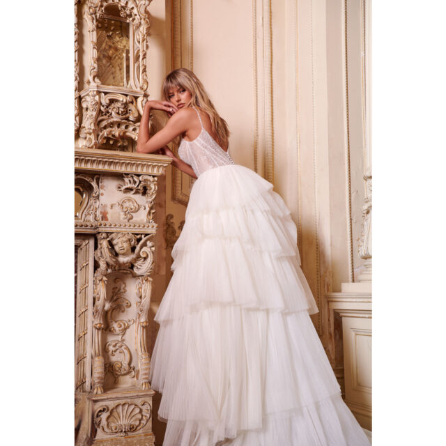 Designed for elegance and grandeur, Liza is a dedication to the Upper East Side and all things New York socialite. Her a-line skirt is striking and dramatic with asymmetric layered pleated glitter tulle and a sequined chantilly under lace for layers of dimension and sparkle. Complemented with delicate beading and a soft and cooling charmeuse inner-lining, this chic wedding dress is designed to keep the bride comfortable and cool from ceremony to receptio