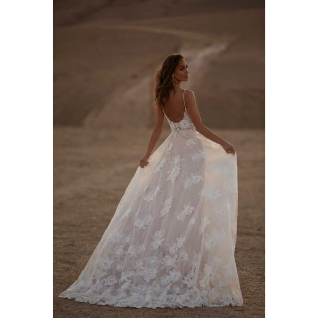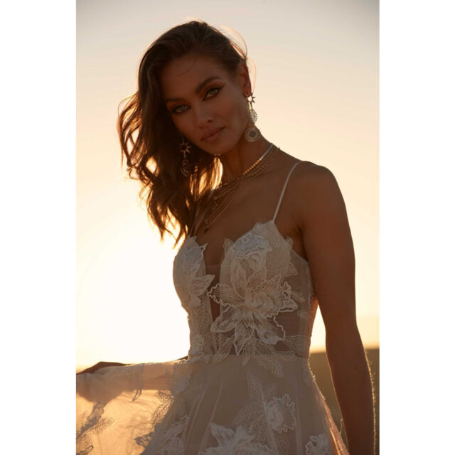 Somewhere between the snow draped Atlas Mountains and red Marrakech desert is where you’ll find Avery. On a first glance some might say she is lost, but on a closer look her smile is magical and her movements within the desert say she is very much found. With each walk along the gravely red earth her skirt billows around her. The thin spaghetti straps create a casual ease reciprocated by the large floral lace falling across the gown. Avery twists and turns dancing with the mountains as her backdrop, showcasing her low circular back finished off with six pearl buttons. As the sun turns golden Avery’s glitter under-layer seeps through the soft tulle lace making her pulse and shimmer. Modernised with some dripping gold earrings and hair in loose waves turns Avery into a visual masterpiece.