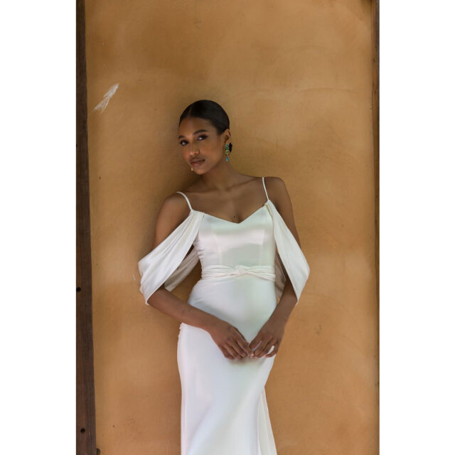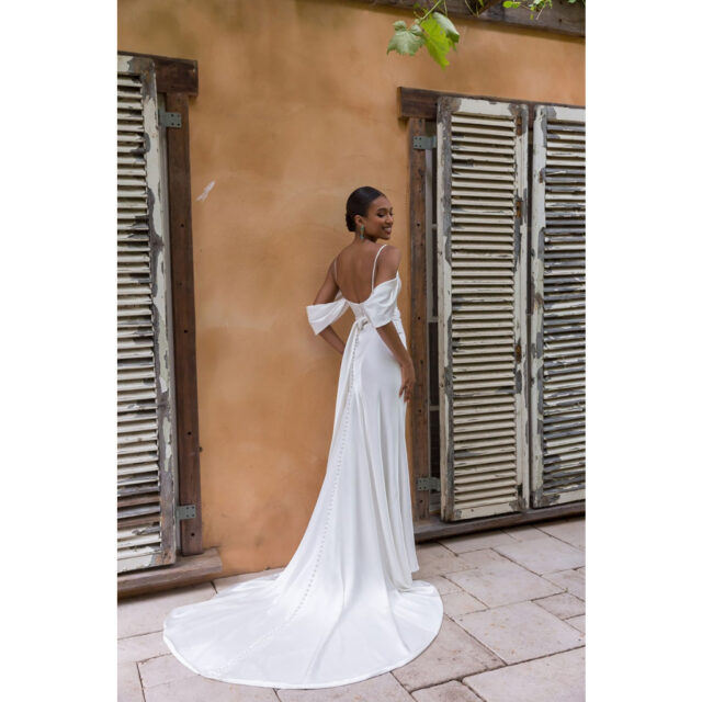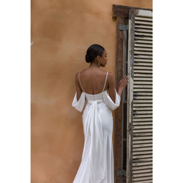 Simplicity and elegance come easy in the Prescott gown with her chic approach to bridal fashion. Her soft silk satin fabrication drapes with ease along the feminine form, feeling buttery soft beneath fingertips. The perfect wedding gown for the minimalistic bride, she features a shallow sweetheart neckline, spaghetti straps and wide pleated off-the-shoulder straps that drape delicately along the upper arm and elbow. Complete her look with the detachable tie-up belt in matching silk satin material, tied with a centre knot to highlight her waist. A signature part of her design is her centre back buttons trailing from back to hem, adding a touch of elegance to her modern look.
