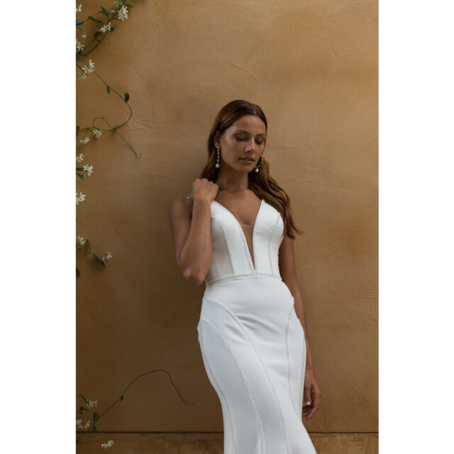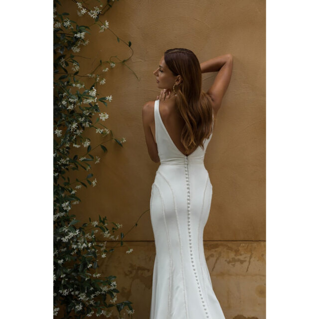 Minimalistic and elegant, you’ll find Perryn down the neoclassical aisles of Lake Como, a vision of the modern brides dream wedding gown. Her light crepe fabrication hugs your curves with flattering ease. Strategic beaded trim shapes the body highlighting the feminine form with exquisite intricacy. Her boned bodice crafted with Madi Lane’s signature construction forms a deep plunging V neckline, mirrored with a V-back that is completed with centre back buttons to her hem. Her fit and flare silhouette finishes in a dramatic sweeping train, perfect for a show-stopping down the aisle moment.