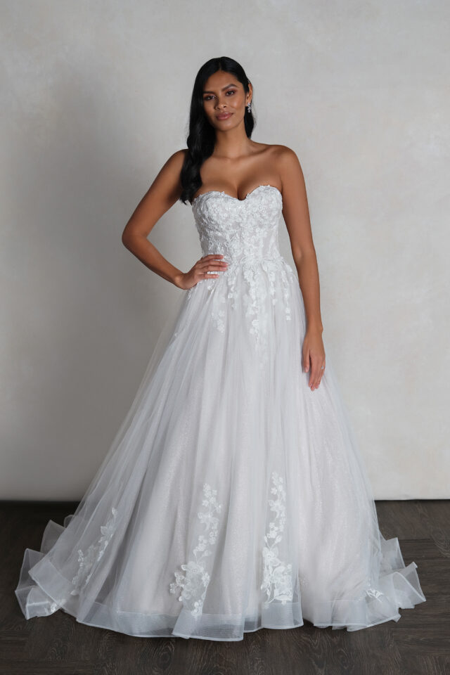 Strapless ball gown with sweetheart neckline accented with subtle demi cups and exposed boning. Featuring a glitter tulle underlay. Bodice embellished with tonal beaded and sequined lace appliques. Sequined lace appliques float off throughout the skirt between two layers of tulle. Finished with horsehair hem, chapel length train, and glitter tulle covered buttons on back bodice.