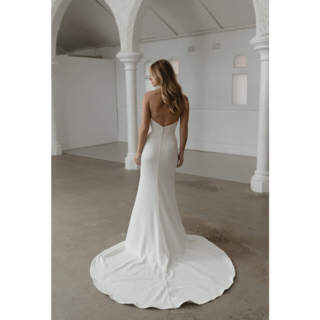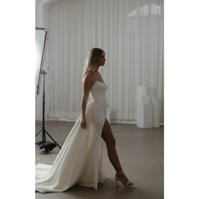 Introducing Seth, a modern masterpiece. With exposed boning in the bodice, her cat eye neckline and moulded cups infuse elegance. The sleek high leg split. Enhance her charm with detachable half pearl and tulle sleeves. Crafted from light crepe with a charmeuse lining, Seth combines luxury and style for your special day.