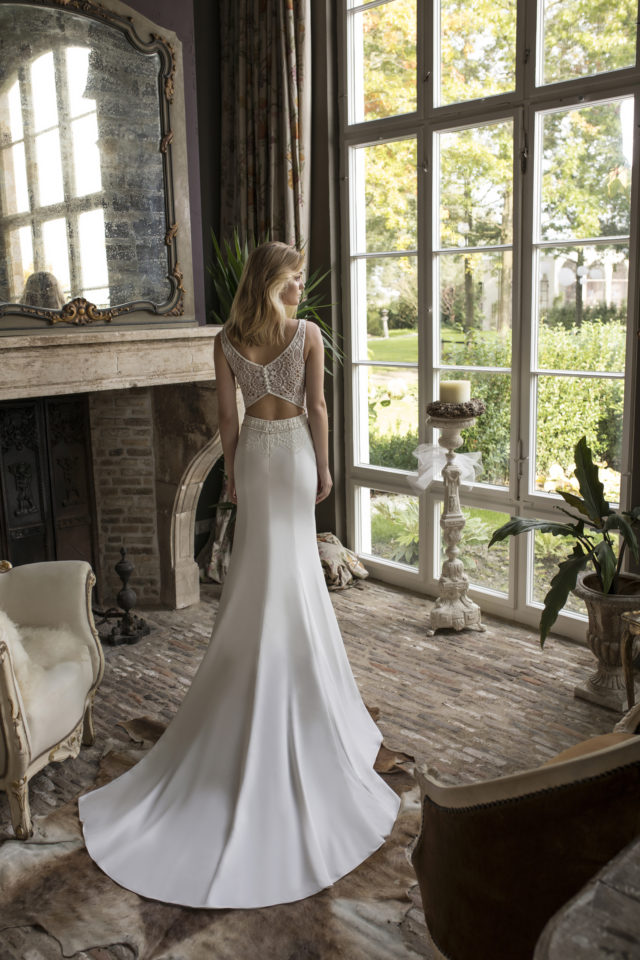 An elegant A line gown with Boho inspired lace bodice fading onto hips. Delicate beading accentuates the waist and neckline.