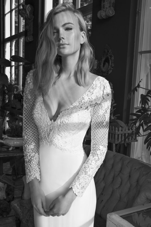 Delicately beaded empire bodice with full length sleeve and fitted soft A line skirt