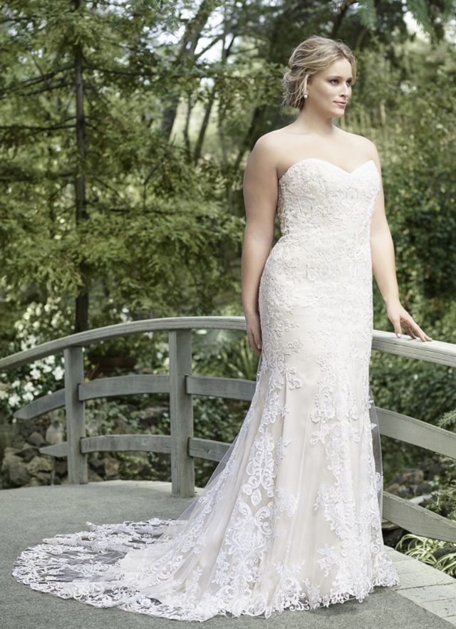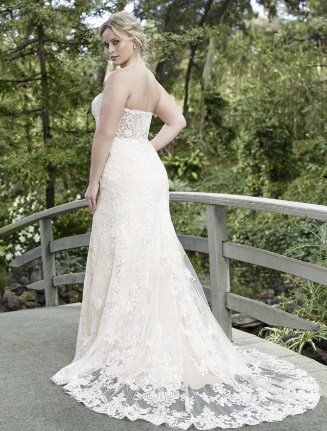Laurel, with its beaded ivy lace on netting over perfecting satin, is the picture of feminine grace. This Fit and Flare gown features a strapless, sweetheart neckline and a soft illusion back bodice dotted with a floral lace overlay. The cathedral length train is a simply stunning finish to the gown, and the lace overlay trails demurely behind the blushing bride who chooses to call Laurel her gown.