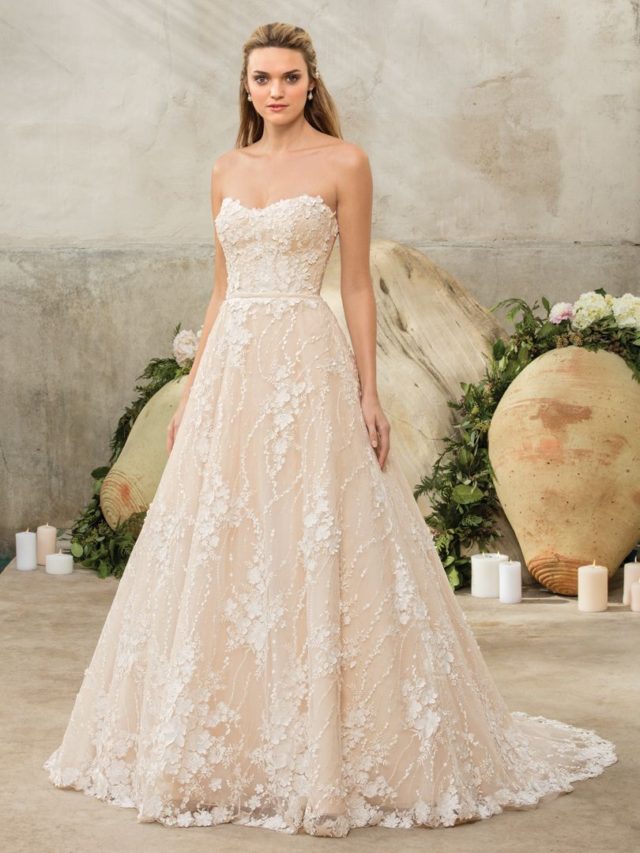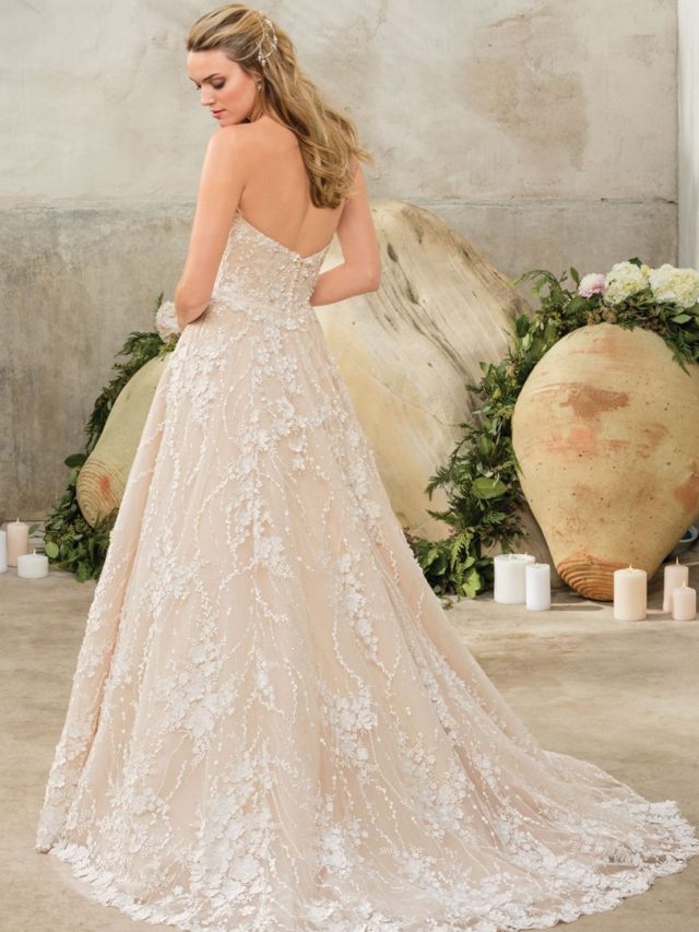 Style 2288 Sienna is stunningly one of a kind in an entirely approachable way. Scatters of sequins stream through the lace, which is a strapless ballgown with a modified sweetheart neckline. Dimension is added with the floral lace appliques that rise slightly off the surface, along with a velvet ribbon sash. High above the chapel length train sit a set of crystal buttons.