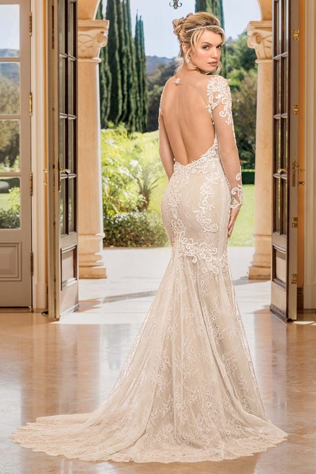 Chantilly lace fit and flare base with a layer of shimmer tulle woven in. The illusion bateau neckline flows into long illusion sleeves and into an open keyhole back. The semi-cathedral length train is scalloped and finished off with an eyelash trim.