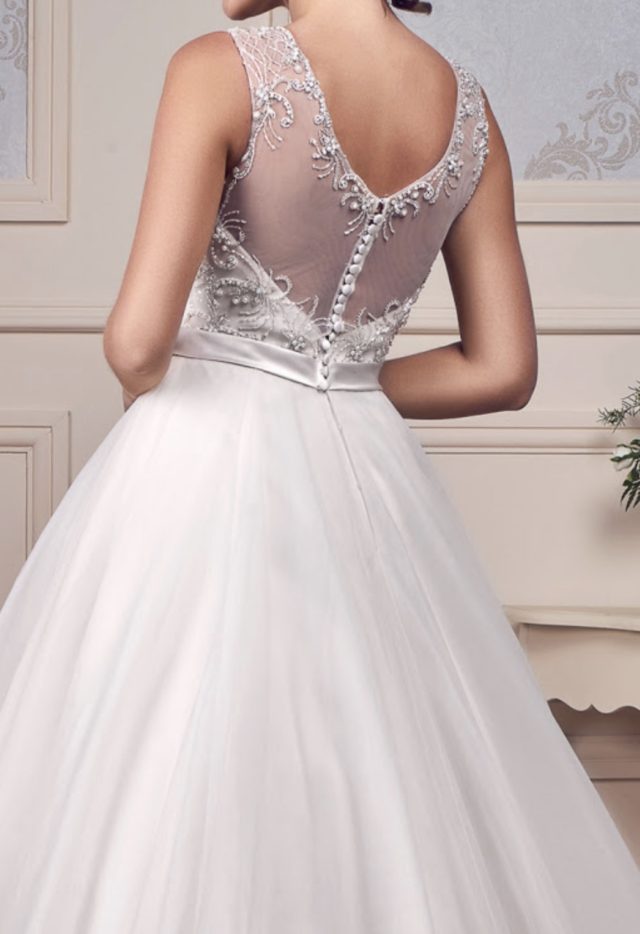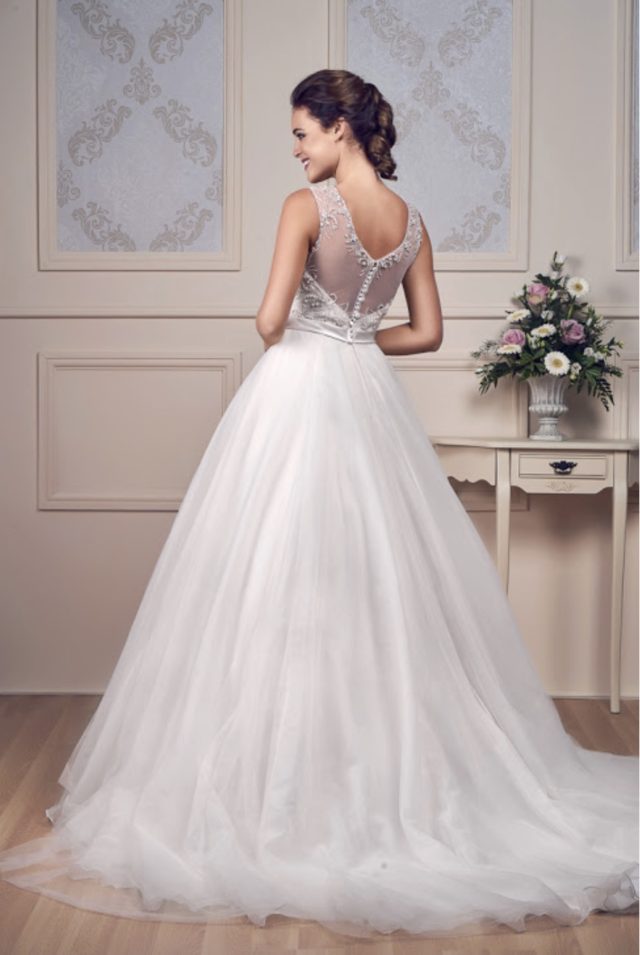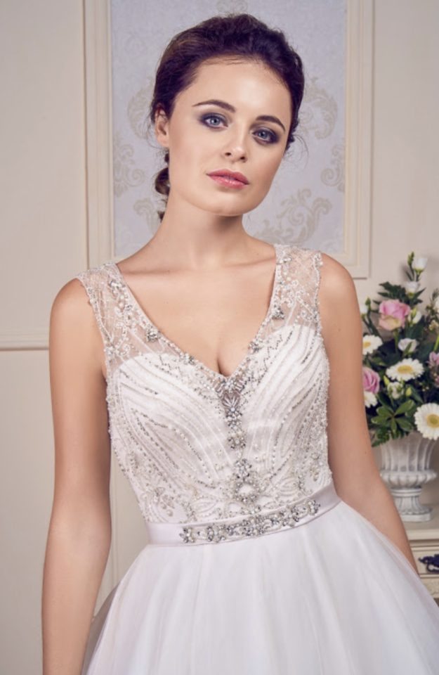 Danielle couture ballgown with a beaded embellished bodice and sand coloured tulle skirt