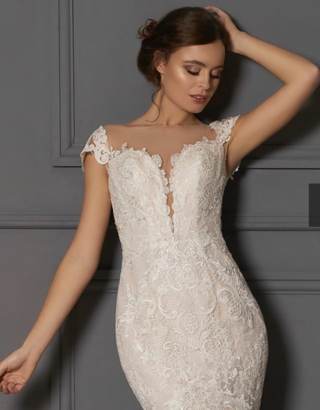 Captivate in this woodland inspired full lace trumpet style dress. A fusion of time honoured and on trend designs creates a unique dress. The plunge v to the waist, with modesty tulle, is a focal point of the long line bodice leading the eye to the full lace hem. An illusion neckline with cap sleeve continue to the deep curve back where button detail from nape lead to the pure lace cathedral train