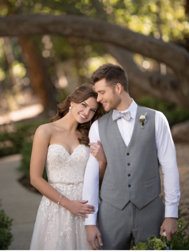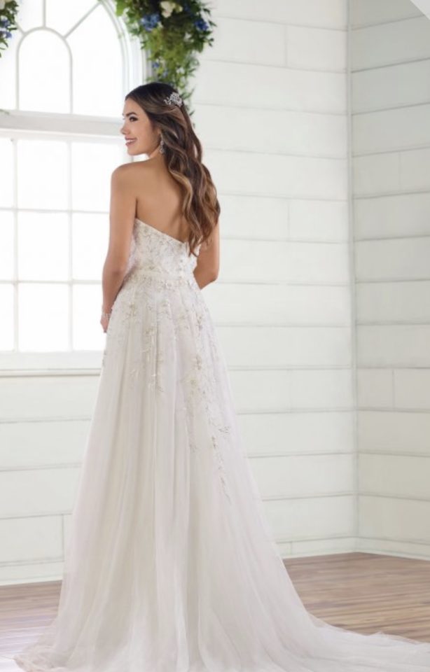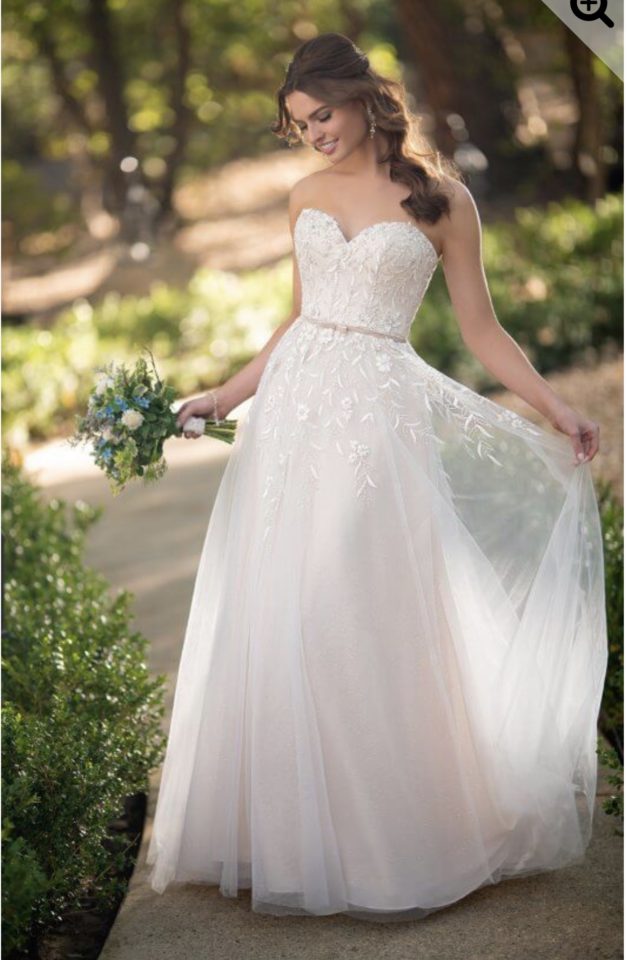 Classy, cute and classic, the playful bride will fall in love with this adorable style. The attached velvet belt makes this wedding dress unique with a vintage touch, while the sweetheart neckline is delicate and feminine. A bright sparkle glistens throughout the soft A-line silhouette, intermingling with a mixture of embroidery, lace and stunning 3D elements along the bodice. Organic, leaf-inspired patterns echo throughout the beading while pearl work adds to the old-world charm. A high back adds supportive construction, complementing the soft tulle skirt and gentle train—featuring an added layer of glitter tulle for an extra dose of sparkle.