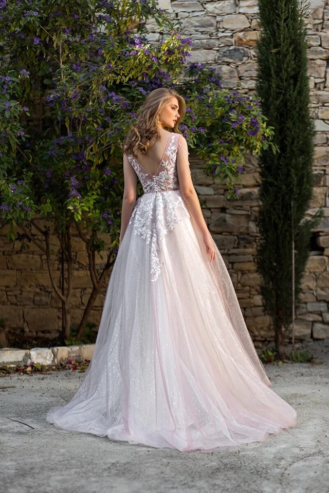 Beautiful lace bodice with pearl button detail on back and beaded shoulder drapes. Shimmering A line skirt.