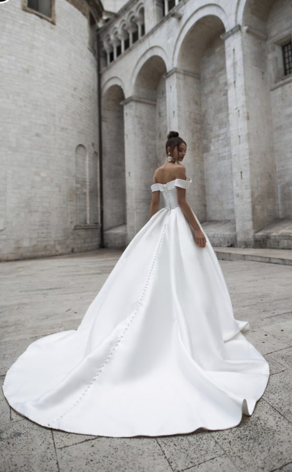 Gorgeous classic style gown with lace up corset back and button detailing through to end of train. Beautiful attached beaded belt and skirt has pockets.