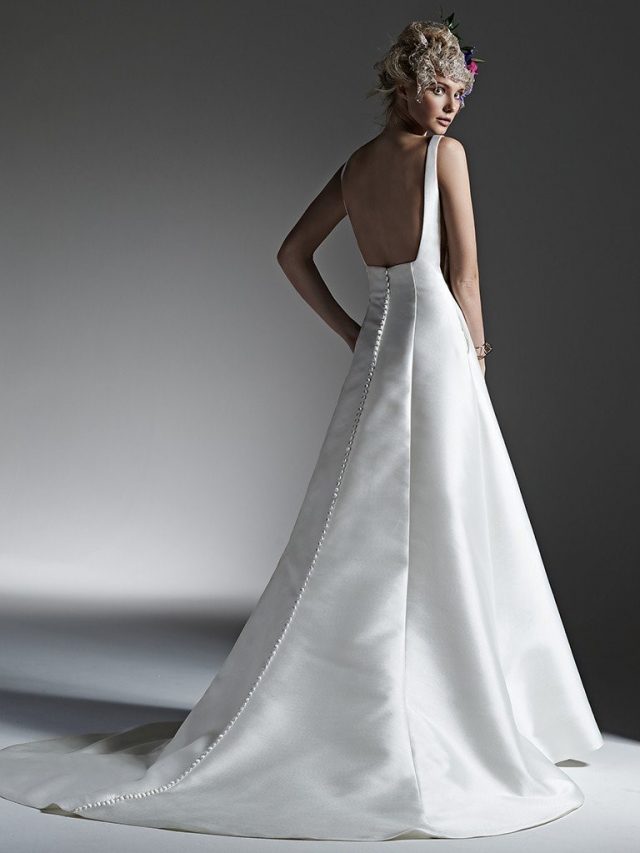 Luxe Reena Mikado creates this dramatic, structured A-line wedding dress with sophisticated bateau neckline, scene-stealing sheer panel inset at side seams, hidden pockets, and stunning open back. Finished with covered buttons over zipper closure.