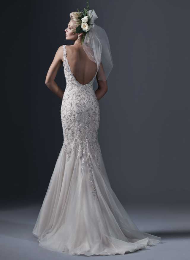 Have you ever seen anything so precious? Holland by Sottero & Midgley is a human size jewel. Covered in lace appliqués and decadently embroidered with dramatic sequins and Swarovski crystals, this tulle fit and flare wedding dress will make you shine like a comet on your wedding day. The daring scoop back and romantic sweetheart neckline with straps are finished with crystal buttons over zipper closure for a comfortable fit, while the alluring skirt with fish train shows off your curves and your feminine silhouette.