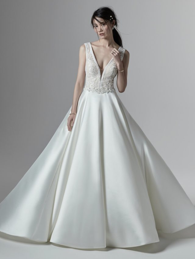 Beautiful A Line wedding dress. Embroidered lace motifs on bodice with nude backing. Illusion V back