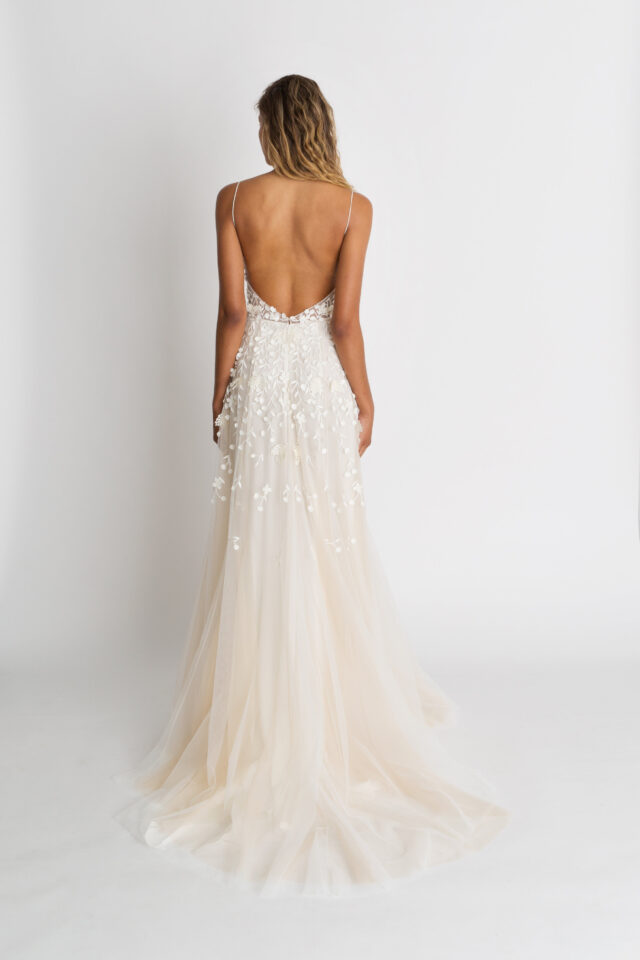 The bodice of this A-line silhouette features hand-embroidered floral appliqué that delicately trails down the skirt. It has a low scoop back and skirt slit and a champagne illusion tulle. Ethereal and ultra-feminine