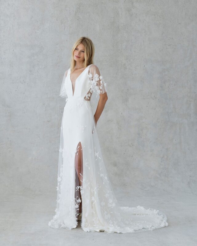 A stunning V-neck gown that hits the right balance of clean modern lines and embroidered details. We love the soft a-line skirt over the fitted lining and the option to add detachable flutter sleeves