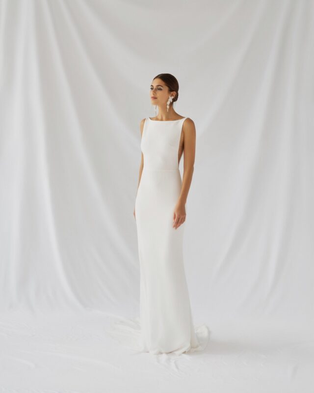 The Viola Gown is oh-so-chic. Featuring a classic bateau neckline, this fitted, silk crepe gown is equal parts elegant and stylish. To add a more contemporary feel, this gown has a square open back and sheer side panels.