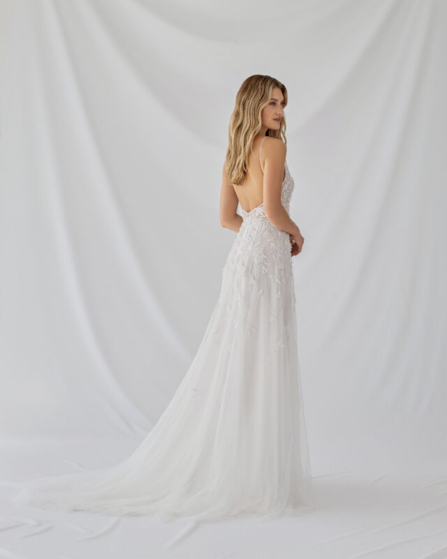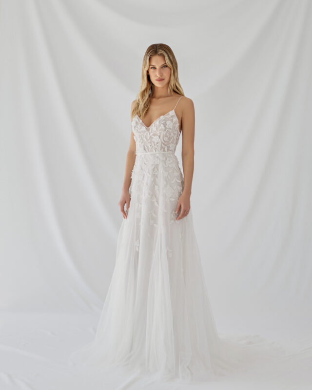The bodice is outfitted in beaded floral applique . With a hint of shimmer, this gown is effortless and requires little accessorizing to make your wedding look complete.