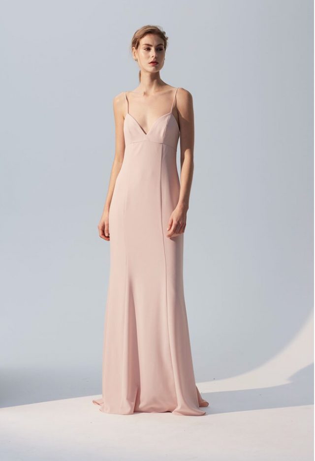 Modern chic, this bridesmaid dress drapes in softly seamed crepe with a sweetheart neckline, an empire waist and shoulder-baring spaghetti straps.