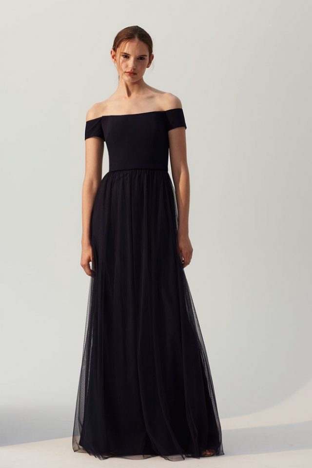 A form-fitting, off-the-shoulder crepe bodice contrasts a skirt of airy gathered tulle on this bridesmaid dress, a picture of streamlined elegance.