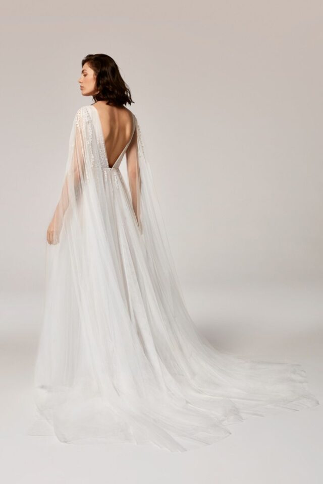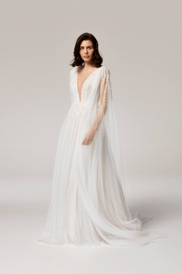 Isla is a soft tulle style with a fuller skirt, ruched bodice and deep V neckline. Delicate trails of applique lace flowers fall down the bodice and cape sleeves.