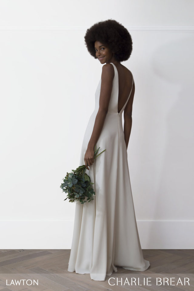 Crepe Boatneck Gown with V Back and A-Line Skirt