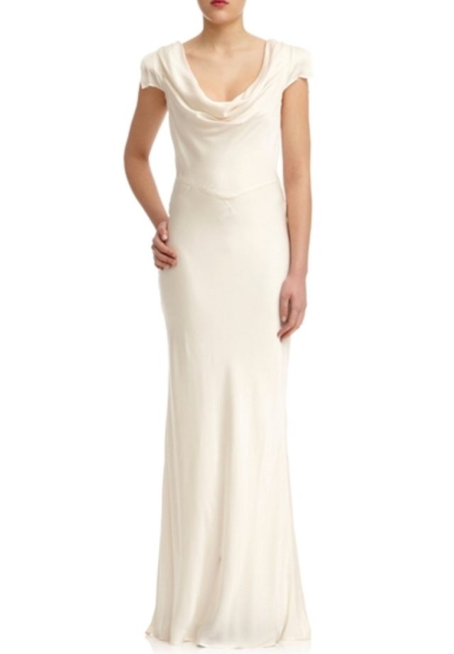 Bias cut fit and flare with cowl front detail. Never been worn