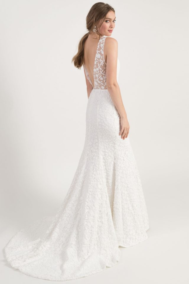 The Arden gown from Jenny by Jenny Yoo is an elegant and classic fit and flare silhoeutte in our new beautiful, sparkly beaded Ada Lace. A chic plunging V neck in the front is complemented by ethereal sheer illusion panels framing a deep V in the back. An invisible tulle insert at the neckline is enhanced by a delicately defined waist to provide the perfect fit all the way down to the court train.