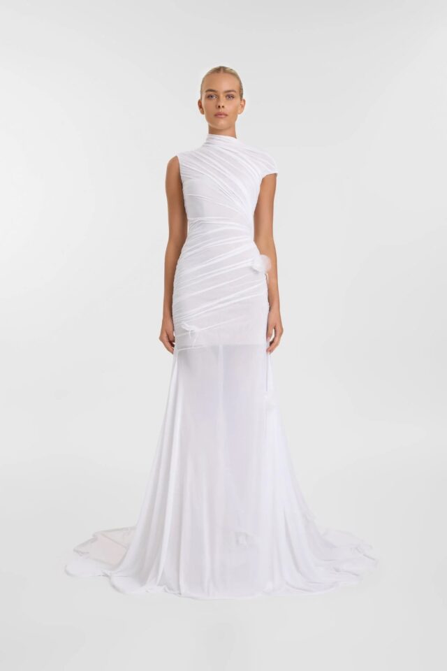 Transform your minimalist game thanks to Sierra’s textural draping. Layered over a corseted mini slip dress, Sierra’s high symmetric neckline delivers cuts an elevated silhouette, complemented by considered abstract floral detailing. Sierra includes both the slip and overlay to deliver a runway-ready look.