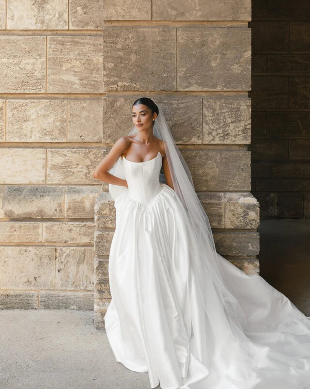 Crafted from a luxe woven taffeta, a gathered Basque waistline accentuates an hourglass shape made modern via a softly scooped neckline. Drama reigns supreme via the ballgown skirt, making Miles a royal lesson in maximalism for minimalists.