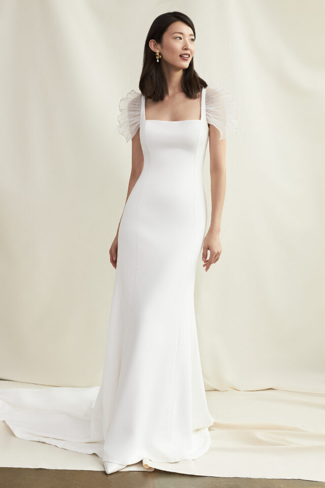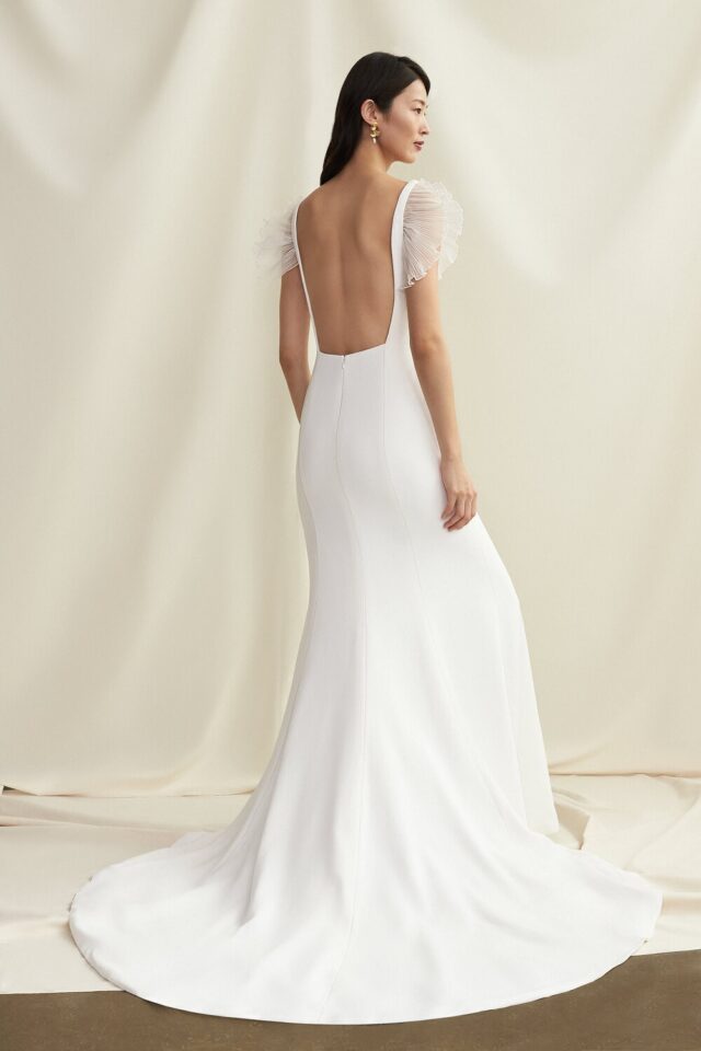 Crepe square neck gown with detachable plisse and pearl sleeves and gorgeous low open back