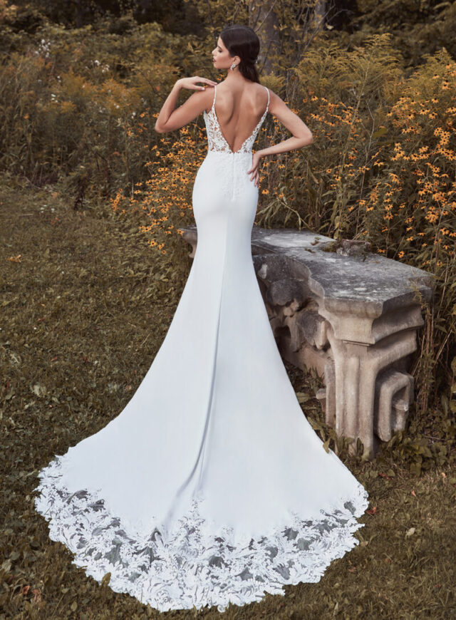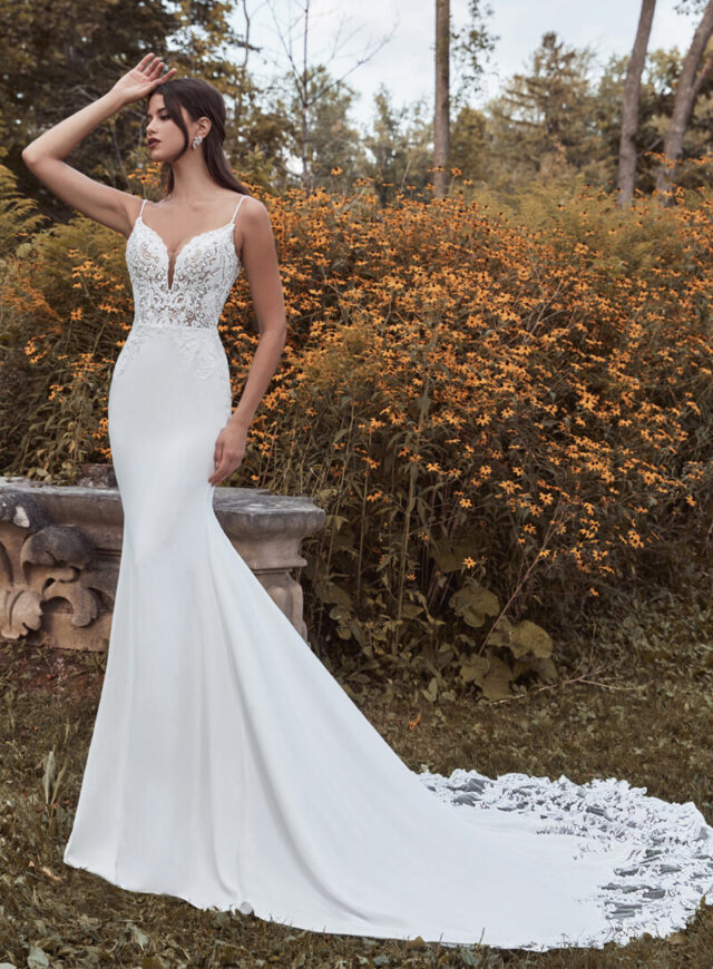 Look like a goddess in this couture-inspired sheath wedding dress. Featuring flirty spaghetti straps, a V-illusion neckline, and a stunning low back – this versatile dress is perfect for both a chic city affair or an intimate destination wedding.
