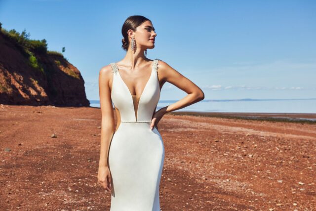 Sleek, sexy and guaranteed to make you the centre of attention, this dazzling little number was designed to stand out. Featuring a daring V-plunge and an equally stunning low back which accentuates the stunning sheath silhouette, this ivory satin wedding gown is for the woman who looks good and isn’t afraid to show it!