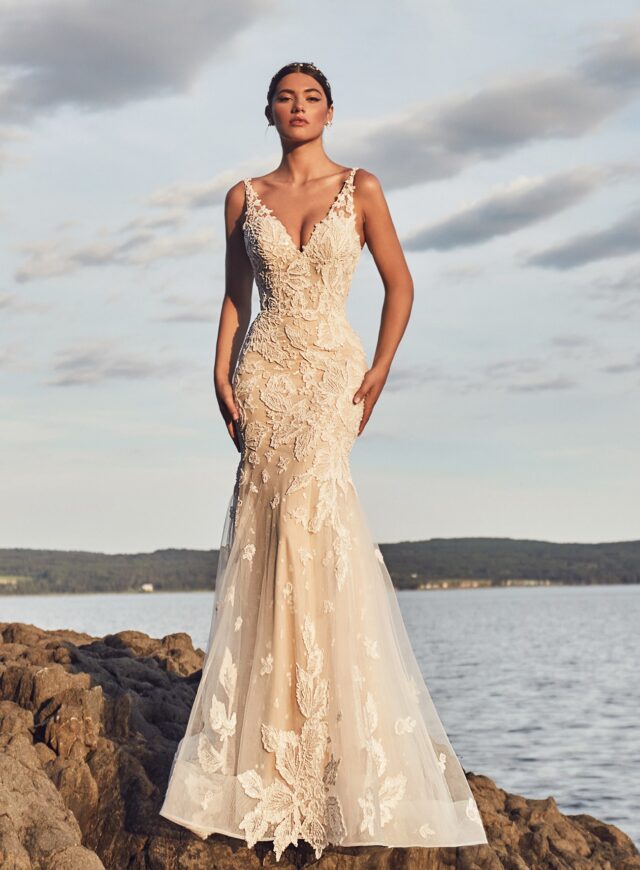Love and beauty are embodied in this stunning floral wedding dress. Featuring the ever-so sexy mermaid silhouette and exquisite beaded lace emblazoned with floral motifs and a cascading train, this dress is perfect for the bride who is both sensual and dreamy.