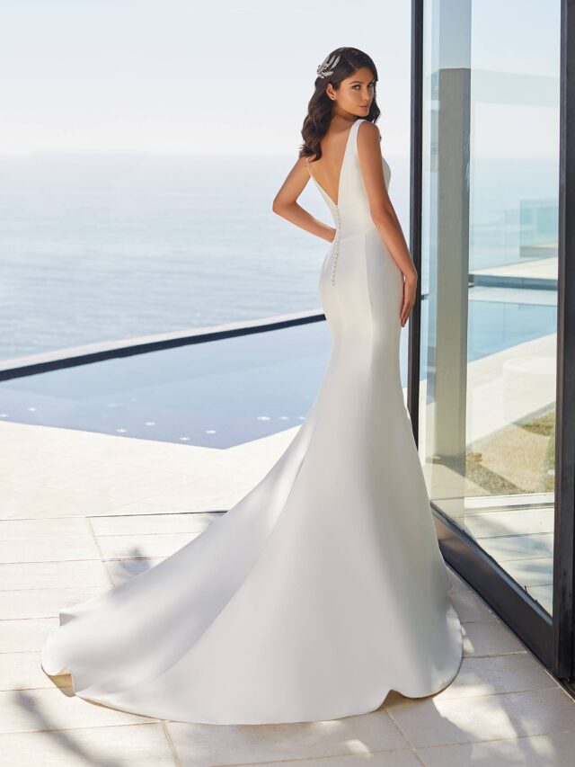 Sheeny Mikado and a figure-enhancing mermaid cut create a ravishing bridal look with a low back and formal chapel train.