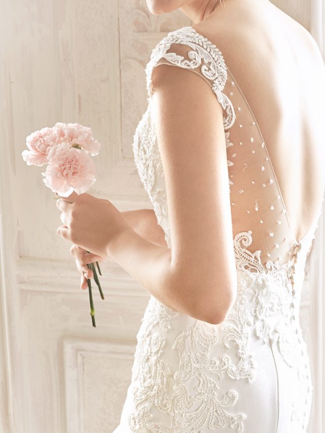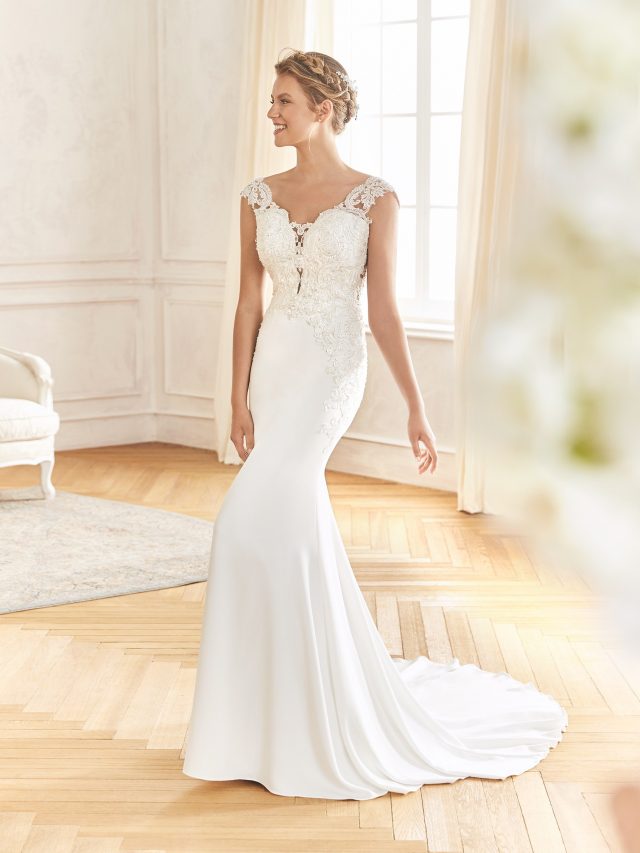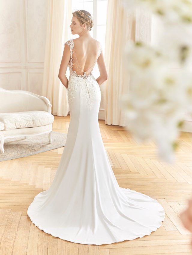 This spectacular silhouette in crepe and rhinestones stylizes the figure to the maximum. A wedding dress inspired by the female body that is capable of accentuating the beauty of its curves and the sensuality of the illusions: