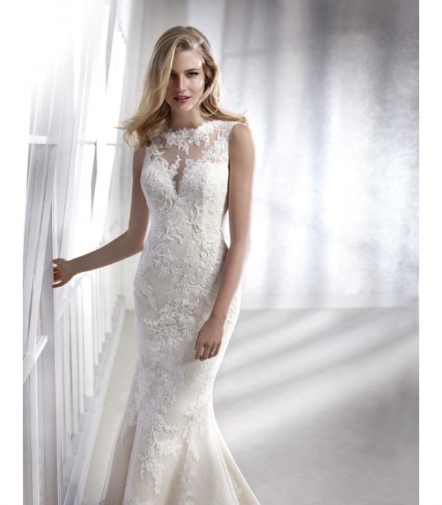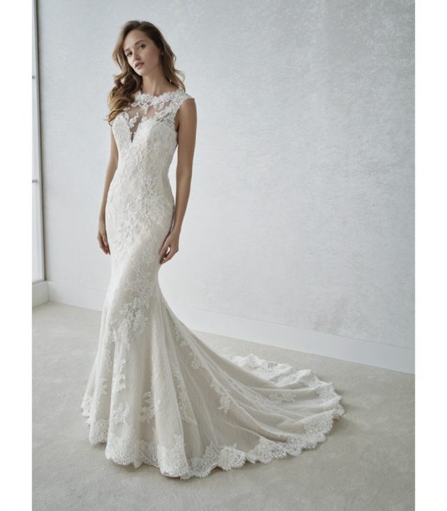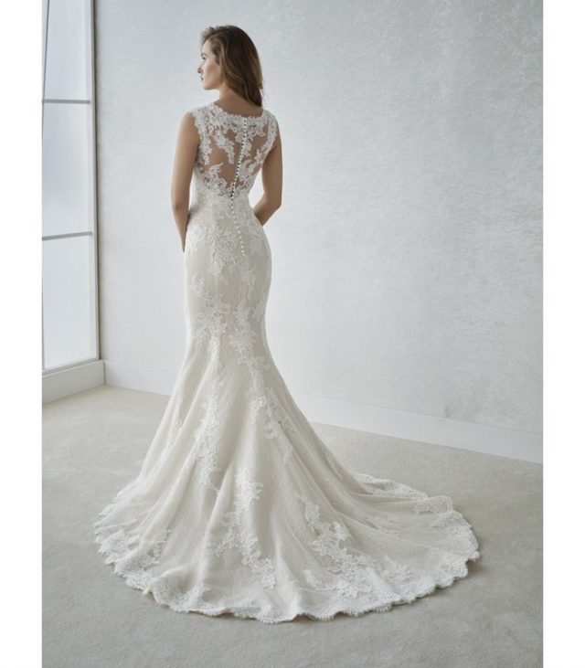 Fit and flare wedding dress in tulle and lace. A low waist design that streamlines the silhouette, with a bateau illusion neckline and a back in crystal tulle.