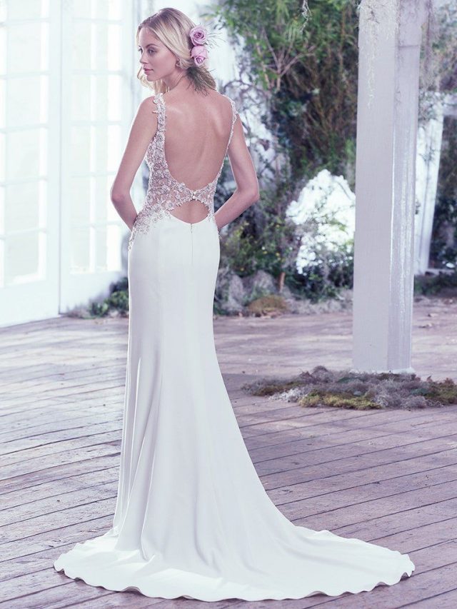 A scoop back is accented with an illusion closure creating a sexy keyhole below the natural waist in this simple wedding gown. Artfully placed lace embellishments featuring Swarovski crystals adorn each illusion side panel adding a modern twist to this Yolivia Crepe satin sheath wedding dress with high bateau neckline. Finished with a zipper closure