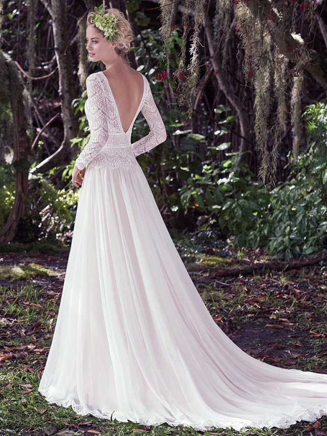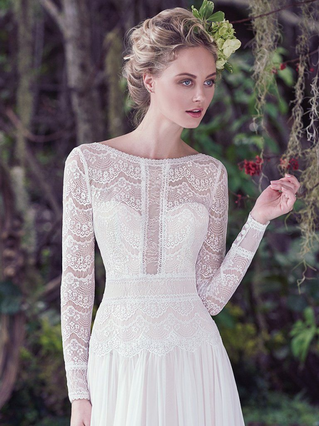 Understated elegance is found in this sleeved wedding dress, comprised of lace and Santorini chiffon. Illusion details, a bateau neckline, and a stunning V-back create a sweet-yet-sexy style. Finished with zipper closure