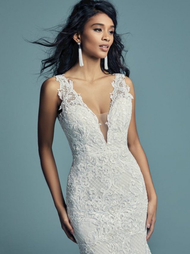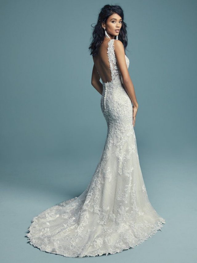 Lace motifs cascade over crosshatch and tulle in this unique fit-and-flare wedding gown, completing the bodice. Featuring an illusion plunging V-neckline, straps, and square back. Lined with shapewear for a flattering fit, and finished with covered buttons over zipper closure.